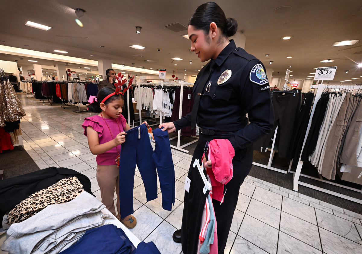 Eight-year-old Mia Sabastizaga gets help picking out clothes from Santa Ana Police Cadet Hannah Aburto at Macy’s during Santa Ana PD’s Shop with a Cop event.